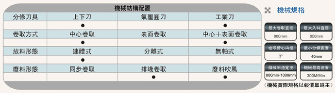 成品卷取方式:可配備板條式氣壓軸及滑差式卷取軸,適用更廣范圍,換軸方式經(jīng)特殊設(shè)計(jì),可以隨時(shí)更換。